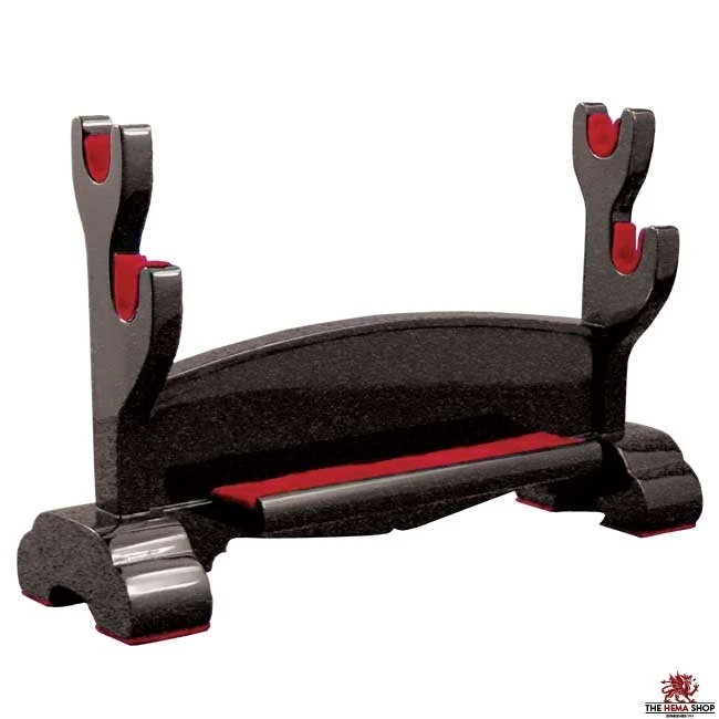 The OH1213 Table Display, produced by Hanwei, the maker of our top-of-the line Samurai swords, will display either a two-sword or three-sword set to perfection. The support rails, lined for protection of the sword’s finish, carry the Katana and Wakizashi, while a padded shelf is built to display a tanto but adds to the appearance of the display even when unused. A maintenance kit (OH1003) also displays well on this shelf. Also available OH2104 & OH2105.