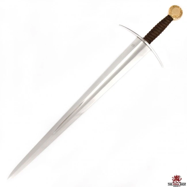 The pommel is cast in solid bronze (like the original) and features the words “SUNT HIC ETIAM SUA PRECUNE LAUDI” which is interpreted as “Here also are the heralds of his praise”. The grip is made from wood and wrapped with leather just like the well preserved original. The durable steel guard also follows the proportions of the original sword. Its high carbon EN42J Spring Steel blade has been forged and tempered to perform its historical counterpart and tapers strongly from the guard to the tip. It has a core hardness of 45HRC approx. with an edge hardness of 50HRC approx. The 2mm edges are suitable for blade on blade work (not re-eneactment safe) but are better suited to being sharpened. A well-made wood lined leather scabbard with integrated leather belt is included. Definitely one of the nicest swords we’ve ever handled!