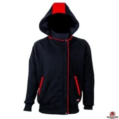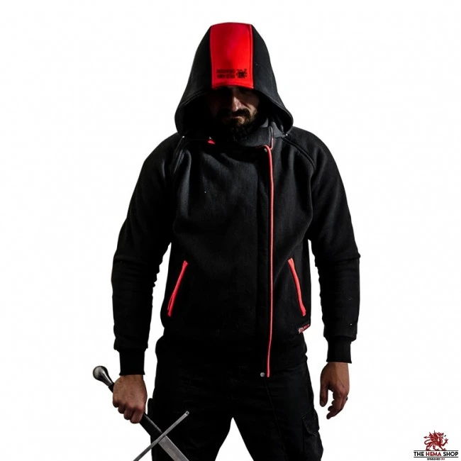 Our stylish Light Sparring Hoodies feature integrated foam pads in the shoulders/upper arms and elbows/forearms. These pads can be removed for washing, or when you simply don’t require the protection they afford. The collar features a blade catcher and integrated plastic throat protector backed with a foam pad to absorb impact. This is securely fastened by Velcro and is also removable. The long zip is reinforced by a press stud at the top and bottom and the hood can also be unzipped and removed if required. It features reinforced elbow patches and zipped pockets.