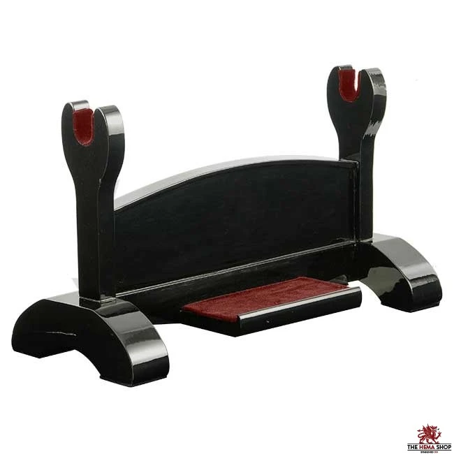 Our Katana Stand is built to display a single katana to great effect. The padded shelf allows the additional display of a tanto or a maintenance kit. The rich black lacquer finish will enhance the display of any of our Hanwei Katana. Also available OH1213 & OH2104.