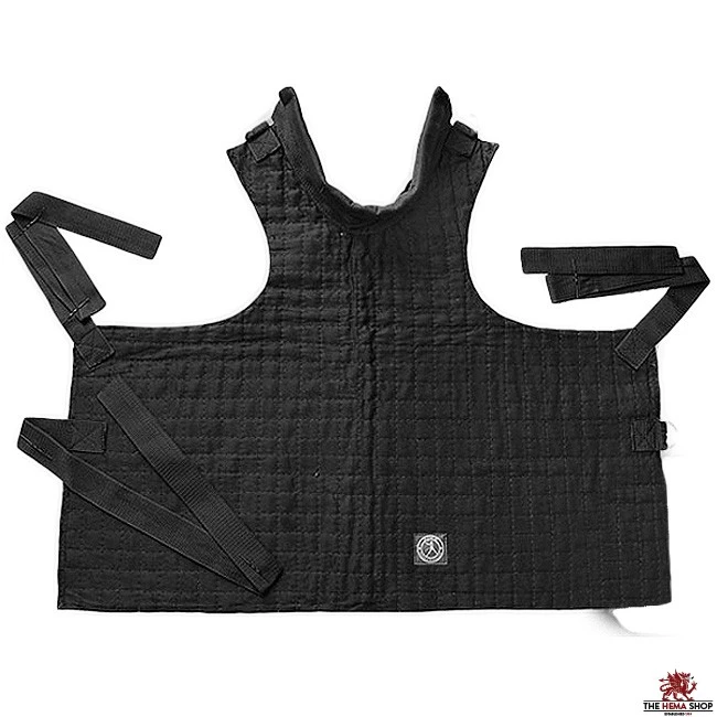 The body protector is designed to protect the torso. It is made of six layers of thickly woven, quilted fabric. It is used for protection against internal injury. It also has an additional collar with a turned edge that protects the neck. It is fastened in the back with three straps