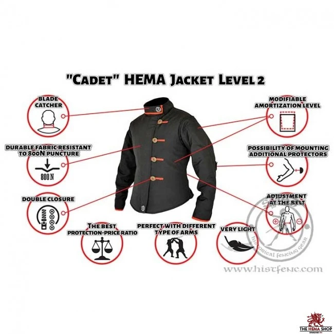 Cadet HEMA Jacket is characterised by great durability. It is very comfortable, light and provides freedom of movement during HEMA training. Cuffs of the jacket have cut-outs which make it easier to put on.