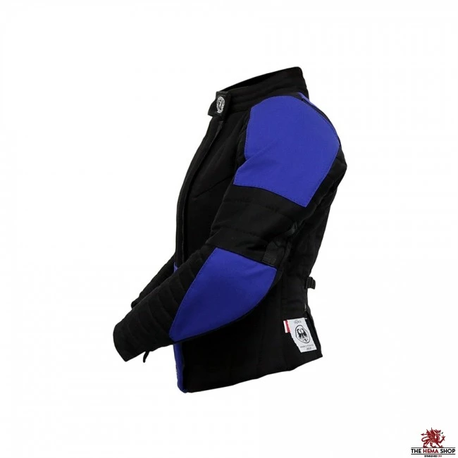 It’s a bicolor jacket with features typical for the PLUS jackets: bladecatcher, adjustable belt on the back, mounting points on elbows, black trim on the front, a double fastening (velcro + zipper), and side slits. Sections in the blue color are placed on the abdomen, shoulders, upper part of back, and on the sleeves under the elbows.