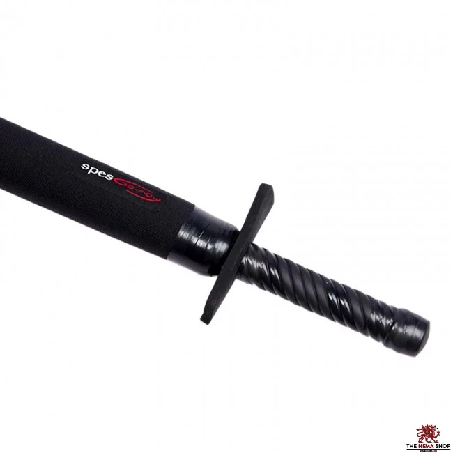 It is a one-handed sword made of black, durable materials. The blade is smooth and the handle is twisted. The styrogum crossguard is simple and stable.