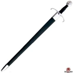 The sword is black with a red handle surrounded by a black string. It has a crossguard in a contrastive color.