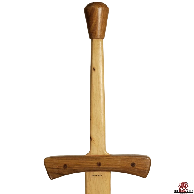 The advantages of this two handed training sword made of wood are obvious. On the one hand, the risk of injury is significantly lower. On the other, this wooden sword can withstand hard blows while your valuable steel sword is safe at home. Of course, even hardwood is not indestructible and can break along the grain, but this two handed training sword should be your first choice for practicing. The wheel pommel and crossguard are made of darker wood to emphasize that it looks like a sword from the 12th to 15th century.